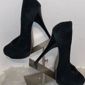 Suede pumps with an approximate 5.5 inch heel and a 1.25 inch platform. Pre loved shoe with minor scuffs. Size 8.5M.