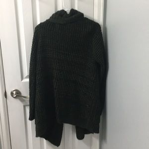 Olive colored long and chunky sweater, perfect to wear w leggings as will cover butt unless you’re super super tall.