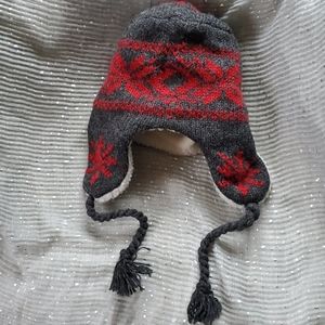 Attractive and unique knit hat.. Very warm, 85% wool, 15% nylon. Lined with 100% knitted polyester. Covers ears. Gently used.