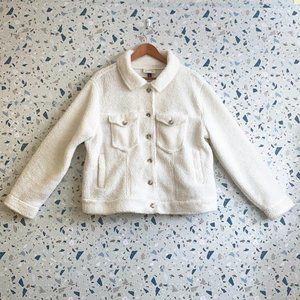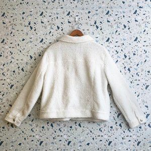 White fuzzy faux fur sherpa jacket. Light brown translucent resin buttons. / Four exterior pockets - two at hip & two breast pockets. Buttons on sleeves. Hits right at the waist.