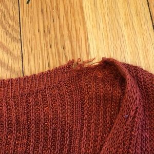 Slight bell sleeve sweater with split sides. Soft thinner material. Small rip in back collar (area typically is covered by hair, and I never noticed it when I would wear it!) reflected in price. Line dried only.