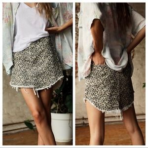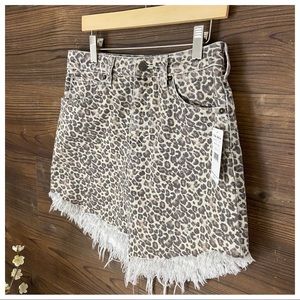 Printed denim mini skirt featuring a statement raw fringe hem.