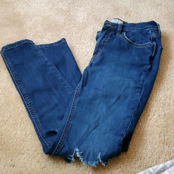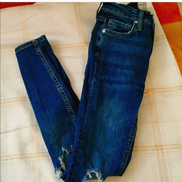 Only 1 pair left. Medium/dark wash. Great condition. Free people skinny jeans with ripped holes in knees. These are one of their best selling jeans. I have them in 4 colors. No stains or signs of wear.. These sadly don't fit me anymore. Size 25 but could fit as size 24 as well. Bundle to save. Im 5'3 and these are a perfect length for me. More of a petite fit.