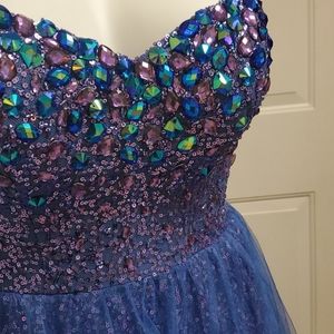 Beautiful indigo strapless ballgown by Maggie Sorterro. The dress is covered completely with sequins. Skirt also has a tulle underskirt as well as a blue tulle layer over the sequined skirt. Only worn once! My mannequin is bigger than the size 8 dress so zipper wouldn't zip all the way in the picture but it does function properly. Dress also has the Maggie Sorterro signature corset cinched back.