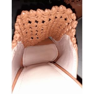 AD & Daughters, Charmmed leather woven mule, has a leather sock Logo imprinted and flexible leather outsole, Approx. 3.7" heel. In color Camel, From AD & Daughters, the Charmmed Mule features: