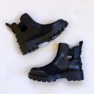 New In Box- UGG Stockton Black Leather Ankle Boots With Round Toes, Cutout Design On Side With Adjustable Buckle Closure, Back Pull Tabs, Cushioned Foam Insoles And Lightweight Rubber Lug Outsoles. Shaft Hight 4.75”, Heel Hight 1.5”.