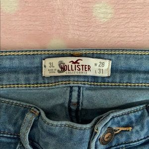 Hollister 3L skinny jeans. Feel like more like jeggings. W 26 and L 31. Does have two loop holes that are tearing. One is hanging by a thread and the other is starting to tear. (Seen in pictures) does have an S on the tag.