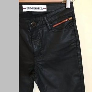 Worn once, in mint condition. A slick coating gives cropped skinny jeans a leather-like finish, while zippers trim two of the 6 pockets. Button closure and zip fly.