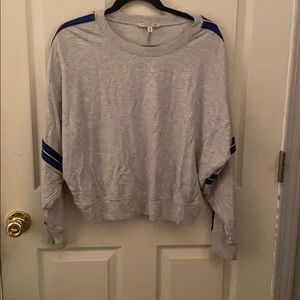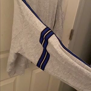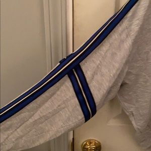 This light grey crewneck is loose fitting with stripped detailing along the sleeves (black, blue, and white). Never worn.