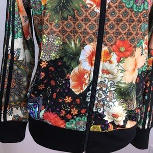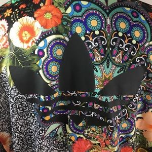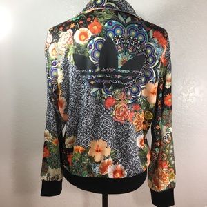 More pictures than this still couldn't show you the beauty of this jacket. 2 zipper pockets & zipper closure up to neck top, the 3 stripes down both sleeves, Adidas logo( back) & smaller Embroidered logo on front. Machine wash cold,gentle, turned inside out with Zippers zipped w/like colors. Do not iron, dry Clean or bleach. 100% Polyester. Measurements: Width 22 inches from underarm to underarm lying flat across chest. Length from shoulder to hem 24 1/2 in. Nonsmoking Home. No Trades.