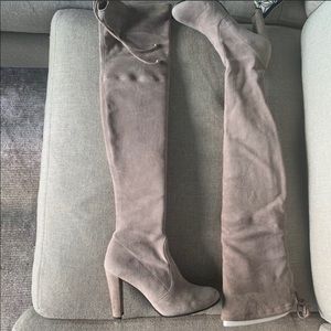 Stuart Weitzman Suede Over the knee Grey boots. Really great condition. Honestly don’t know if I’ve worn them more than two times. Posted pictures of a small red mark and scuff though you can’t notice them. You can tell by the soles they are barely worn.