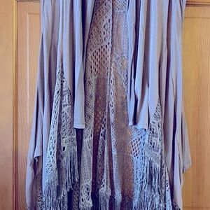 Brown Sleeveless Cardigan with Lace and Fringe Detail.Barely used. Neck: 94% Rayon, 6% Spandex; Lace: 65% Cotton, 35% Polyester. Chiffon: 100% Polyester.