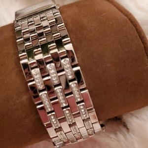 Silver metal band,with rhinestone diamonds in pattern on link and around watch. Rose gold watch face. Beautiful condition. Comes with booklet and case. Needs new battery.