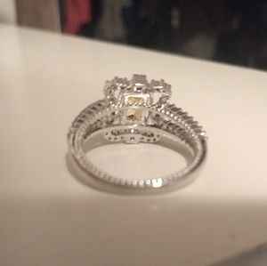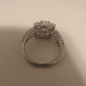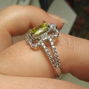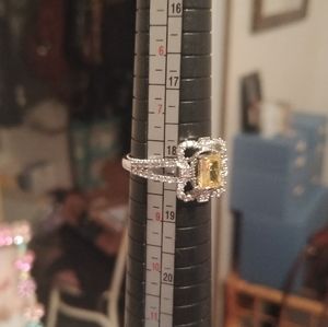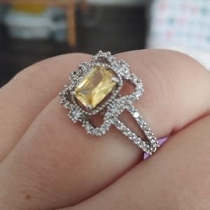 Features a center citrine, a split shank side, + a fancy open design around the mains stone, all covered in different cuts of dazzling white topaz that look like diamonds!