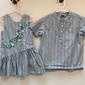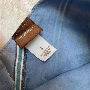 Blue chambray dress with pinstripes and embroidered flower detail. Skirt has asymmetric flared hem. Button back. Worn and washed once so excellent condition but is wrinkled from air drying.