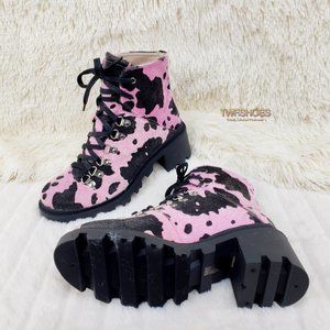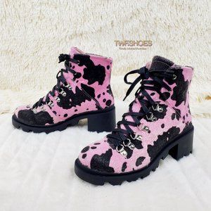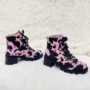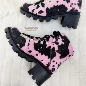 Baby Pink Faux Fur Cow Print Lug Sole Emo Ankle boots