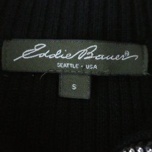 Eddie Bauer Sweater Mock Neck. Full Zip . Ribbed Black Body with Silvertone Hardware. Super Stretchy. 85% Pima Cotton Blend. Machine Wash. Tagged Size S.