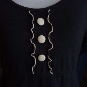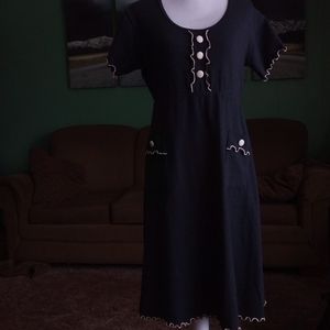 Nice, quality-weight fabric. Cloth-covered buttons and ruffle hems on sleeves, hem, bodice and pockets add cute details.