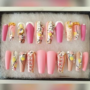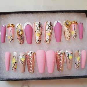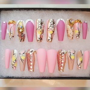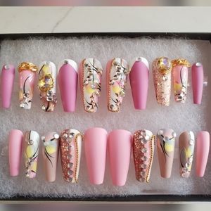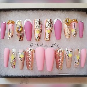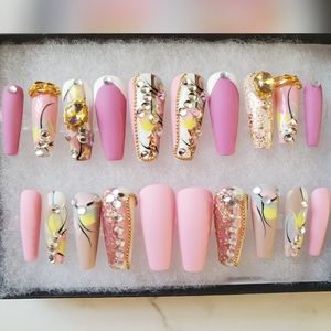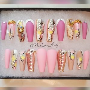 Be a show stopper with these luxurious hand made one of a kind beautifully designed press on nails 💅 No longer will you need to go to the nail salons. These designs are one of a kind. Buy multiple sets to mix and match. You will receive 20 nails in each set so your fingers are sure to fit these beauties.Each purchase comes with a buffer, a file and adhesives and can last for months with proper care. Use glue for longer lasting. Luxury designs at affordable prices.