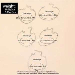 Elevate your everyday style with this exquisite 5-piece silver-tone bracelet set! Crafted with delicate chains and charming details, this versatile collection offers endless possibilities for mixing, matching, and stacking.