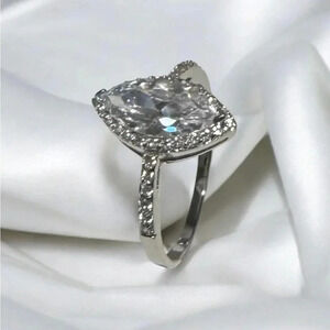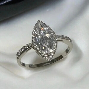 Sterling silver ring with a large marquee cut cubic zirconia with smaller stones