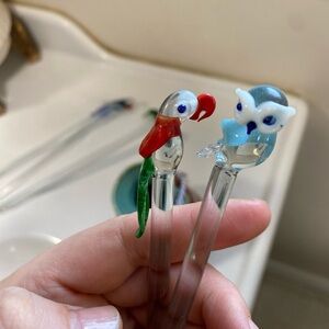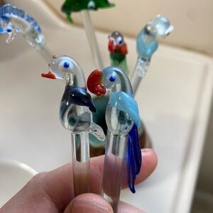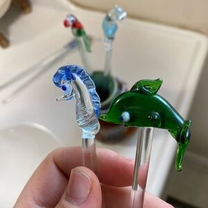 Mixed lot of 6 Glass Swizzle Stir Sticks Hand Blown. Vintage Stir Sticks - Glass Swizzle Stirrers - Retro Barware - Bloody Mary... This set of 6 Glass Swizzle Stirrers is perfect for your next party or gathering. The bird and seahorse and dolphin shaped sticks are a colorful addition to any drink, especially a Bloody Mary. Made of high-quality glass, these stirrers are durable and easy to clean. With a fun and festive design, they are sure to be a hit with your guests. Bring some old-school charm to your barware collection with these Vintage Stir Sticks. Vase comes for free.