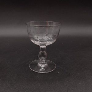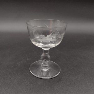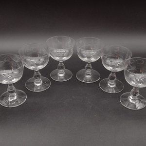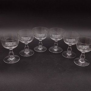 A set of 6 etched crystal wine or liqueur glasses. The etching is of a floral and leaf theme. They stand 3 3/4" tall and have 2 3/4" mouths.