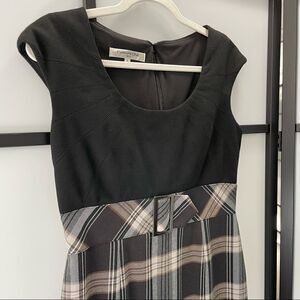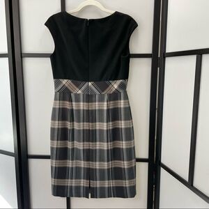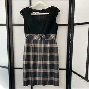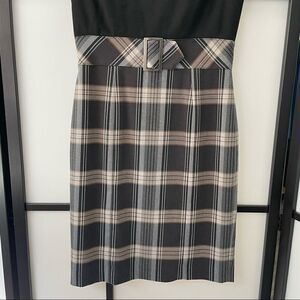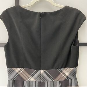 [6] Evan Picone Neutral Tone Plaid Sleeveless Belted Midi Dress Black Tan & Grey