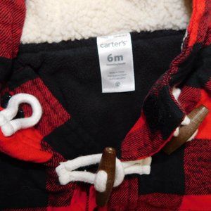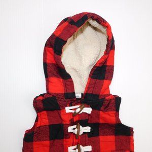This adorable Carter's 6 Months Red Black Buffalo Plaid Fleece Lined Hooded (sherpa lined) Vest is in Great clean condition. Shell is 100% Cotton - Lining of Hood and body 100% Polyester. Machine washable.