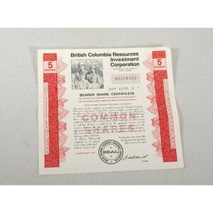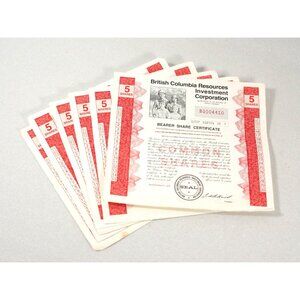 This is a set of 6 Share Certificates for British Columbia Resources Investment Corporation (BCRIC) dates August 7, 1979. Each certificate is for 5 shares. They expired in 2007. Their dimensions are 18 x 19 cm (7 x 7.5 inches)