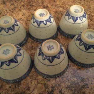 6 Vintage Chinese Translucent Ling Long Rice Tea Cups bowls blue white flower