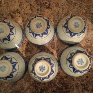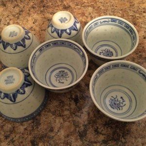 It is a set of 6 Vintage Chinese Translucent Ling Long Rice Tea Cups bowls, blue and white, flowers.
