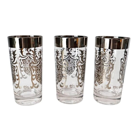 For your consideration is a vintage set of six Kimiko highball glasses from the 1960s, featuring a silver band and a shield crest accent.