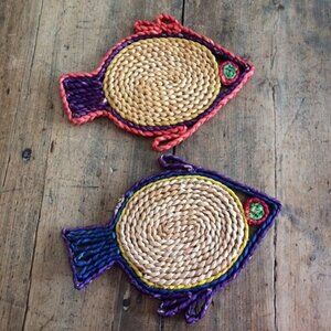 6 Vtg Woven Straw Trivets Grapes Fish Circle Round Tropical DAMAGED Under Plate
