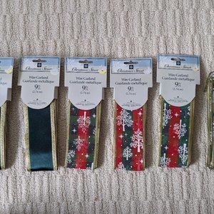 6 packages of Christmas wire garland. 5 still in packaging, 1 is not but unused. They are each 9 feet long. Bought at The Bay several years ago. 2 are dark green with sheen and gold edges and the other 4 are green and red with white christmas tree pattern and gold edges. They have wire on the edges (under the gold part) so they are bendable if you want to wrap around your Christmas tree, or for another use.