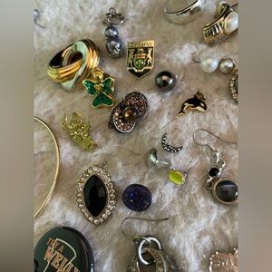 A diverse collection of earrings and pins with vibrant colors. Includes various designs and styles.