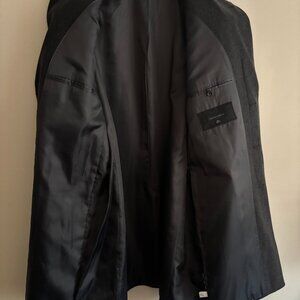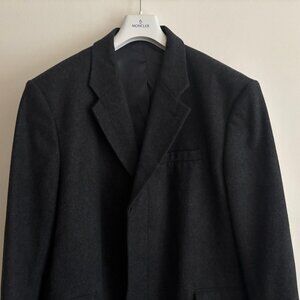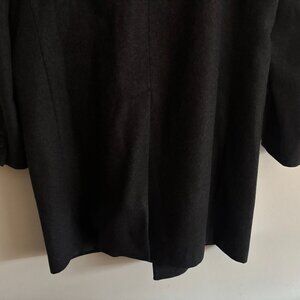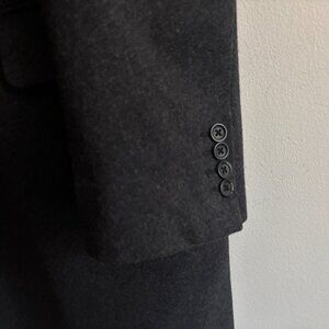 A classic top coat in a charcoal grey wool blend. Appears black in a certain light. Features a notch lapel and flap pockets.