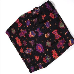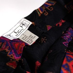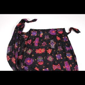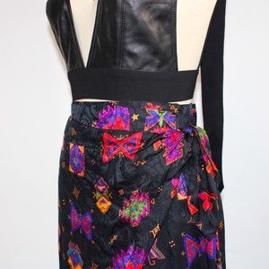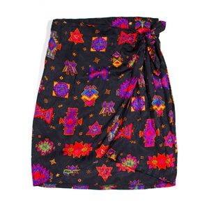 Pure hammered silk wrap skirt, appears late 80s/ early 90s. Mint condition! I see no flaws anywhere on this little gem. Vibrant beautiful print! Side zipper and tie. This silk has a beautiful drape and feels amazing on. Comfortable elastic band encased in silk at waist.