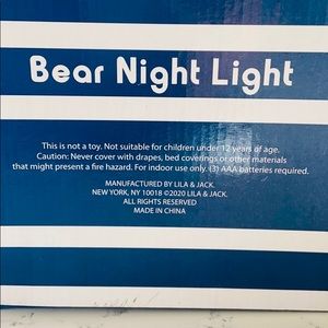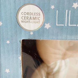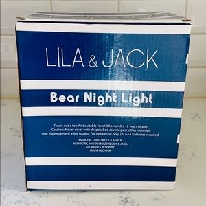 Lila & Jack White Ceramic Bear Cordless Lamp. Perfect for any baby or toddler’s room. Star cutouts project light. Great baby shower, birthday, or Christmas gift. White Ceramic. Cordless. Takes three AAA batteries (not included). Approximately measurements: 8” tall. Excellent conditions. Brand new with tag