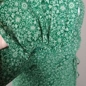 Gorgeous like new Reformation green Rosebud Mini Wrap dress. Lightweight. Bottom half is lined. Elastic cuffed long sleeves. Gathered pleating om shoulders. Hasnt been worn.