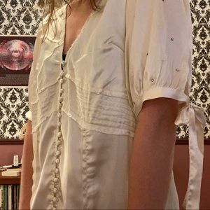 Beautiful white Topshop dress with a silk feel and delicate crystal embellishments on the puff sleeves. Only worn once so this dress is in perfect condition. Purchased from the Oxford Street flagship Topshop in London. Size on tag is US 12.