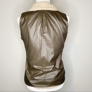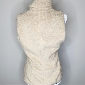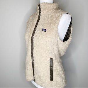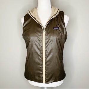 Excellent used Condition Women’s Patagonia Los Lobos Off White Deep-Pile Non-Pilling Fleece and Dark Green Taffeta Reversible Full Zip-up Vest in Size Medium