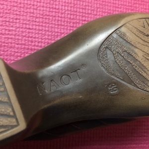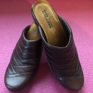 Beautiful and well made mules have a chocolate brown leather upper sewn in an overlapping design that looks braided. The inner sole is a lovely suede. These are a European size 39. I am a size 8 and they fit me fine. Please see the size chart in the photos. There is a very small scuff mark on the left toe. The platform is approximately 1 inch and the heel height is 2.5 inches. EUC.