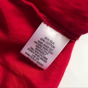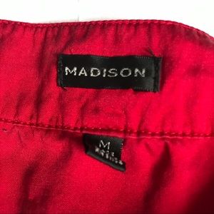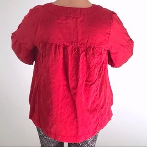 Madison brand Tunic with Pockets and puffy Lantern Sleeves. The fabric is a blend of silk and cotton, with a very high sheen. Buttoned neckline,