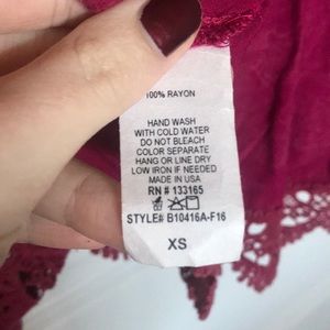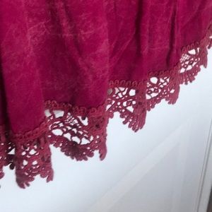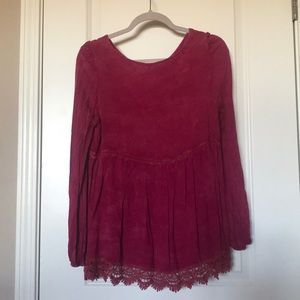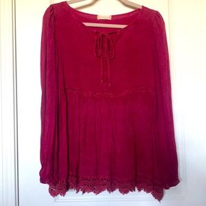 Billowy, earthy, comfy deep berry pink peasant-style peplum top with crocheted lace hem. Balloon sleeves with elastic gathering at the wrists. Relaxed fit looks great with jeans and boots or strappy sandals for transition weather. Could definitely be mistaken for Free People.