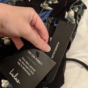 Two piece dress from Lulus, black with silver and blue floral stitching. Never worn, with tags! Adjustable, top laces up in the back. Fitted, the crop top shows a little more of my stomach than showed in the pictures from the website. Would be willing to sell either piece if you were just interested in one! Let me know if you have more questions!
