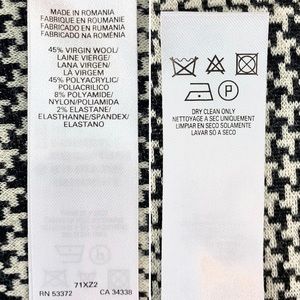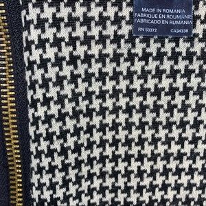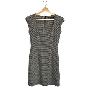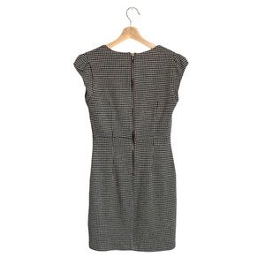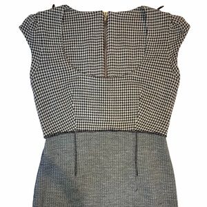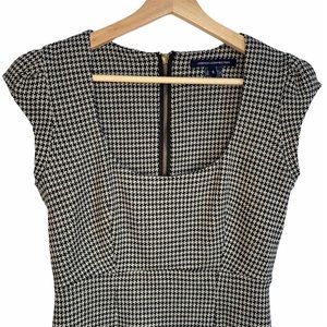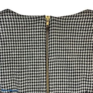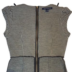 French Connection dress with black & off-white Houndstooth pattern and exposed brass zipper closure on back. Made from thick stretch knit and fully lined above waist. Made in Romania. In Pristine condition!