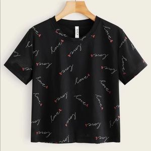 SHEIN love text graphic crop top. Black. Size S. This is a tee and not meant to be tight. Brand new, never worn, no tags because SHEIN brand does not tag their clothing.