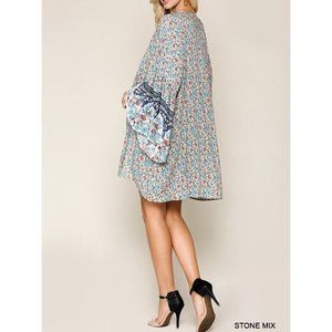 Boho Ivory Blue Floral Border Print Ruffle Bell Sleeve Gypsy Kimono Cardigan Duster Tunic. Stone Mix color. 100% Rayon