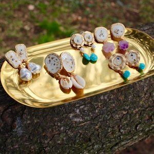 Wire Hammered Gold Earrings with Stone Dangles, Modern Gemstone Earrings, Bridal Bridesmaid Shell Earrings, Gemstone Jewelry Gift, Geometric Statement earrings, Classic, Clip-on ear, healing stone earrings, art deco, museum earrings, luxury Sxxx